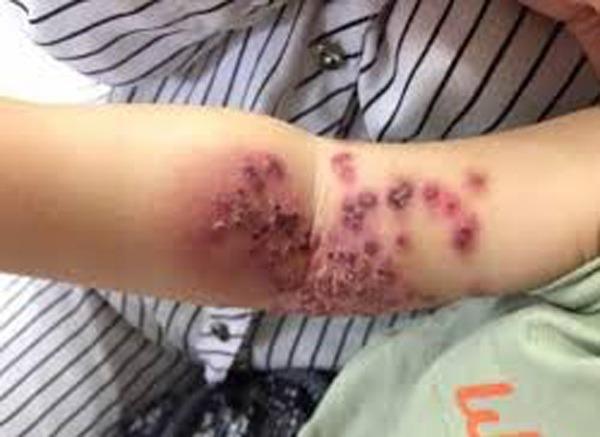 Bé gái bị nổi phát ban mụn nước do người mẹ bị nhiễm herpes đã hôn em.