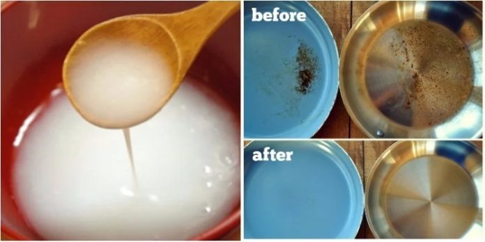 Những chiếc nồi bằng nhôm, gang, inox để lâu ngày không dùng đến sẽ xỉn màu. Để nồi bóng sáng trở lại mọi người hãy đổ nước vo gạo vào đầy nồi, sau đó bắc lên bếp, đun cho đến khi nào nước sôi, để một lát rồi tắt bếp, nước nguội hẳn thì trút ra, rửa sạch nồi lại bằng nước là nồi đã sáng bóng trở lại.
