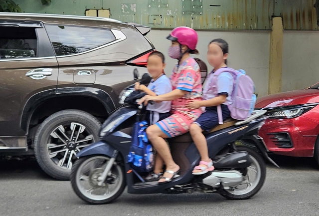 Nhiều phụ huynh vẫn chở con trên 6 tuổi ngồi phía trước xe máy tham gia giao thông